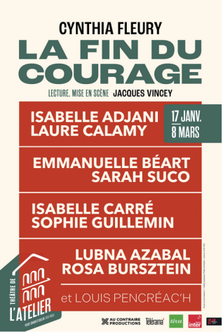 La Fin du courage, is a theatrical adaptation of the eponymous essay by philosopher and psychoanalyst Cynthia Fleury. It's a diversity of voices and viewpoints, reflecting the essayist's cherished idea that courage is built on plurality. A lively, profound dialogue, imbued with humor and self-deprecation, that sharply questions what it means to "hold out" in a world of tension.