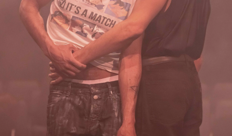 Deux hommes pris dans une irrésistible étreinte. L’un et l’autre se frôlent, se cherchent, basculent et se tiennent au ralenti, comme dans une scène de romance, avant de se dégager pour un brutal corps à corps… Évoluant d’un rose poudré au bleu froid, en passant par la douche acide d’un laser, la lumière accompagne le mouvement de ce pas-de-deux magnétique et toxique. Tout comme le son, habité de matières fantômes.